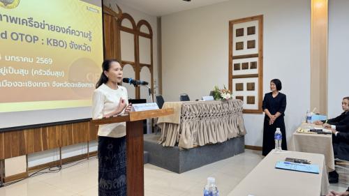 นางสาวเตือนใจ บุญทิม พัฒนาการจังหวัดฉะเชิงเทรา เป็นประธานในพิธีเปิดโครงการพัฒนาศักยภาพเครือข่ายองค์ความรู้ (Knowledge – Based OTOP : KBO) จังหวัด กิจกรรม "ประชุมให้ความรู้แก่ผู้ผลิต ผู้ประกอบการ OTOP" โดยมี นางอาภร โพธิ์เจริญ ผู้อำนวยการกลุ่มงานส่งเสริมการพัฒนาชุมชน กล่าวรายงานวัตถุประสงค์การจัดงาน พร้อมด้วยเจ้าหน้าที่พัฒนาชุมชน คณะกรรมการเครือข่าย KBO จังหวัด และกลุ่มเป้าหมายเข้าร่วมกิจกรรมรวม ๕๕ คน
